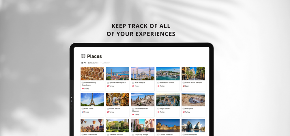 - Keep track of all of your upcoming and past trips in the Trips database. Open up the page of any trip to log any of the places you’ve visited, food you’ve tried, etc.